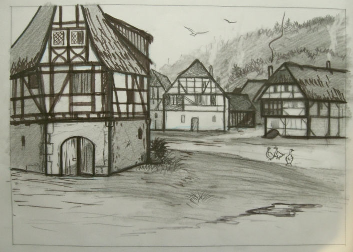 The concept story behind Hamlet Village is one of simple beginnings which evolved through an exchange of ideas with Sorcery Creator and Art Director, Erik Olofsson. The story begins with Andrea's initial concept sketch,