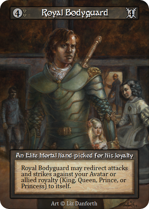 The art concept for this card called for a bodyguard guarding royalty ("Royal Bodyguard), with a cool supporting game mechanic in which the bodyguard absorbs damage.
