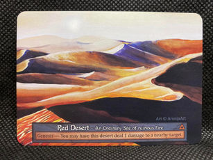 Before the release of Sorcery: Contested Realm, Erik's Curiosa produced Sample Cards used for play-testing the game and given as a reward for Alpha Kickstarter backers and various social media influencers. These Sample Cards showed early mechanics and artwork for cards, offering a glimpse into the design process and serving as a rare historical artifact for fans.